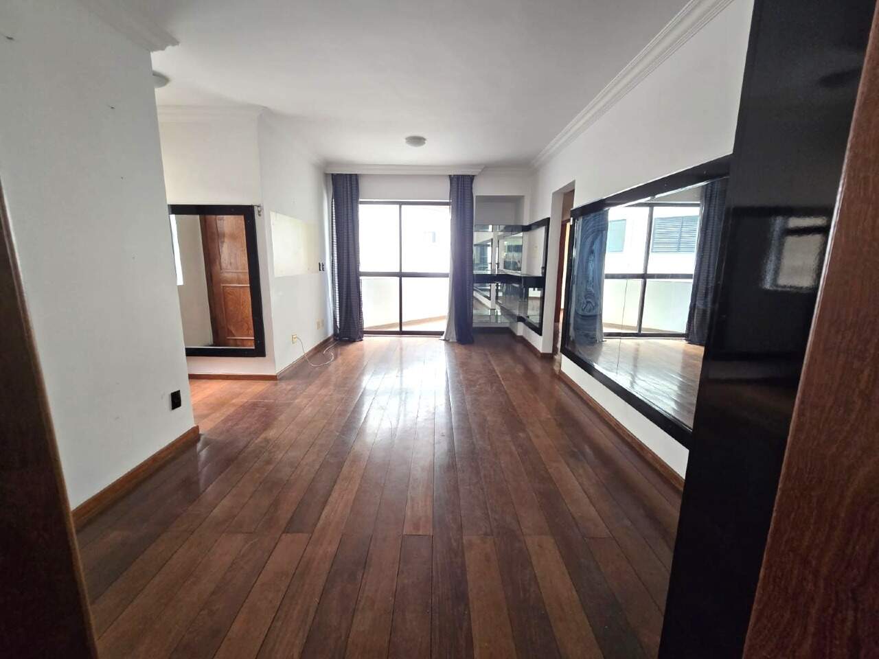 Sala ampla para 02 ambientes com piso em tábua corrida, varanda, vista panorâmica, 03 quartos confortáveis com armário, piso em tábua corrida, janelas com venezianas integradas sendo 01 suíte com painel de cabeceira e tv, móvel, espelhos e varanda, banheiro social, cozinha espaçosa com armários planejados, área de lavanderia independente, quarto e banheiro de serviço.