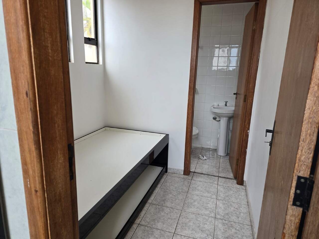 Banheiros com bancada e piso em granito, espelho, armário, e box em blindex